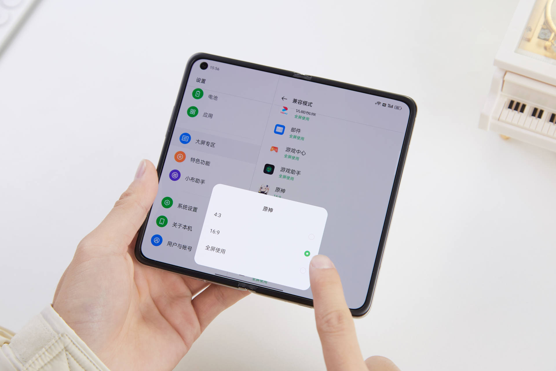 这次OPPO Find N内屏采用的是接近1:1的黄金比例设计,展开后是一块7.1英寸的LTPO屏幕,能够支持120Hz自适应刷新率,是目前折叠屏产品中最高规格的存在。针对大家认为折叠屏比例游戏体验不好这种非议,OPPO Find N搭载的ColorOS 12制定了一套完美的解决方法,可以自定义设置游戏的比例,比如常用的4:3、16:9或者全屏使用等等。如果设置到16:9的屏幕形态,OPPO Find N的则是拥有与普通直屏手机拥有一样的横屏效果,而且视觉效果也要更加大。