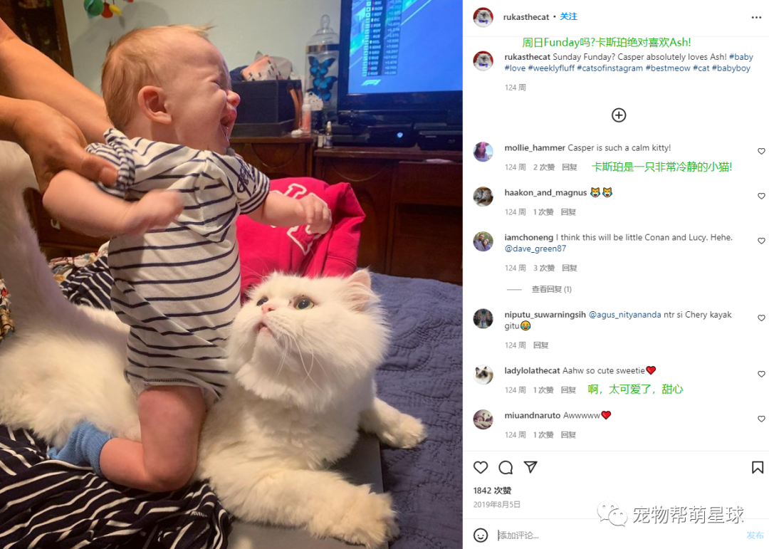 她的儿子Ash从出生起,就有许多猫咪围在身边,每天轮翻照顾,最亲密的是这只白色长毛猫“Casper(卡斯珀)”。
