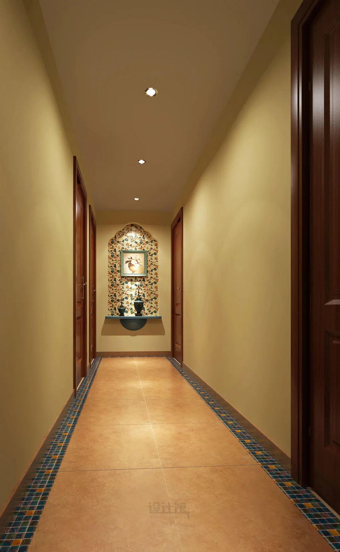如果走廊尽头是墙面,并且走廊比较长的话,建议在这面墙上挂上装饰画,这样走在走廊上会更有氛围感;如果这个这个墙面是内嵌的凹位,也可以在这个位置摆一张展示台,布置上装饰品,让空间更加档次高级。