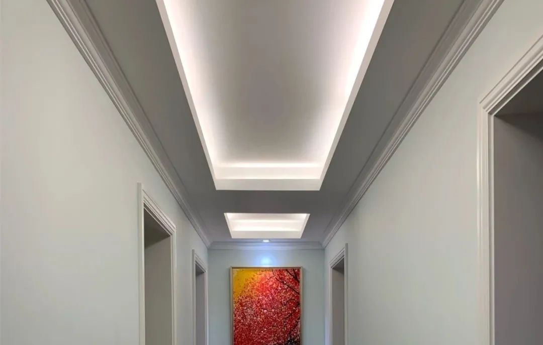 如果走廊的天花没有横梁,也可以采取四周吊顶+灯带的设计,这样可以使得空间更加有层次设计感;并且通过见光不见灯的设计,也能让走廊空间显得更加温馨舒适。