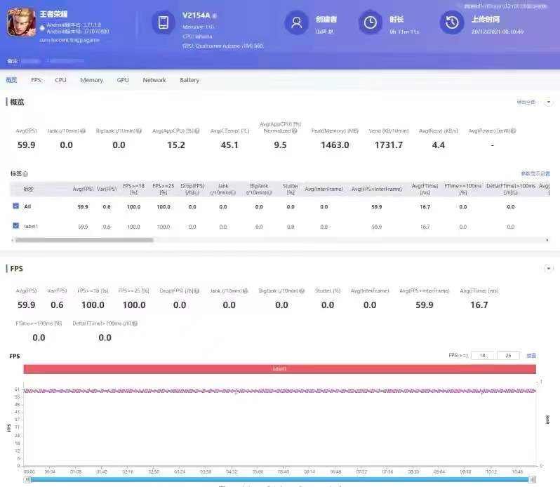 比如说,我在用iQOO Neo5S运行《王者荣耀》时,特意测试了一组帧率,数据显示平均帧率为59.9帧,几乎接近满帧状态,而且帧率波动幅度较小,说明游戏过程中并没有特别明显的卡顿。