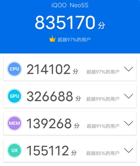首先在核心配置方面,iQOO Neo5S搭载了高通骁龙888处理器,并且配备了增强版LPDDR5和增强版UFS 3.1,这样的“性能三件套”在当下也算是强悍的。同时,根据安兔兔跑分数据来看,该机拿到了83W+的成绩,这也间接性在告知我们手机性能的实力,如果要运行市面上的大型游戏,那基本上是可以轻松驾驭的。
