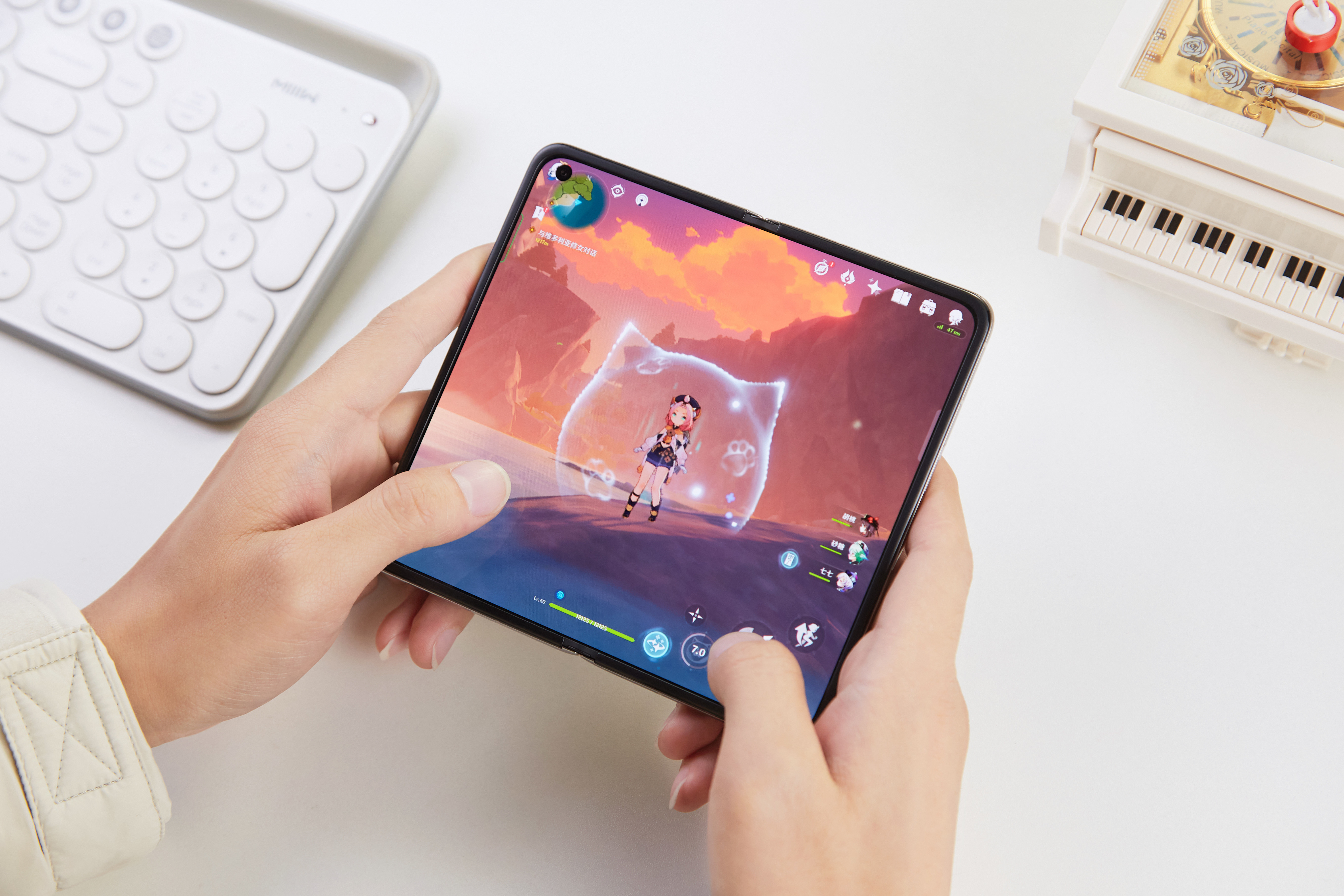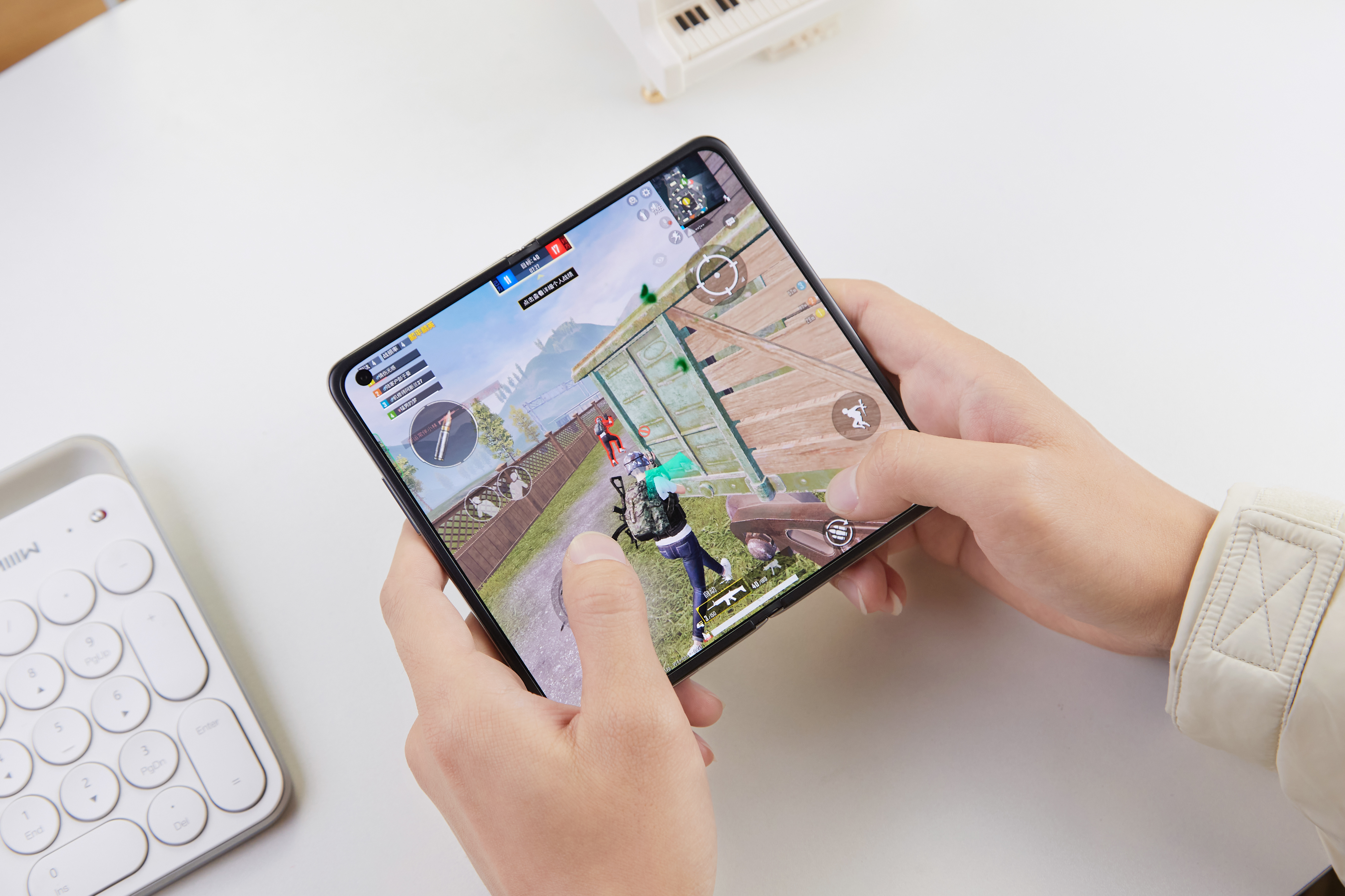 得益于较为宽高的屏幕比例,在用Find N进行《和平精英》等竞技类游戏时,还能够看到更多高处的位置,更轻松的捕捉到敌人的位置和方向,在进行子弹投掷时也能清晰地看到抛物线走向。而且在游戏过程中,人物的全身都会显示在屏幕内,视觉效果更给力。