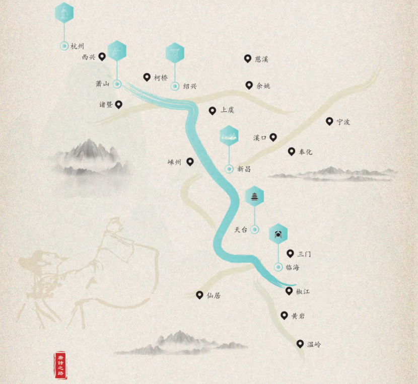 浙东唐诗之路是一条自钱塘江经绍兴,而后经浙东运河、曹娥江至剡溪再达新昌,直至台州天台及温州、舟山的诗意之路。它与丝绸之路、茶马古道、古蜀道一样,回响着文化遗韵。镜湖、剡溪、瓯江、天姥、雁荡等秀山丽水,云门寺、大佛寺、国清寺等名寺古刹,还有百官朝舜、大禹治水、西施浣纱、曹娥投江、梁祝化蝶等美丽故事,吸引着诗人们多情的目光。