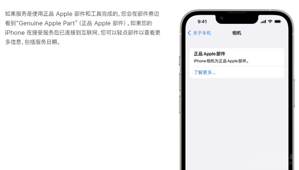 简单来说就是,这一功能可以帮助用户查看更换的零部件是否是正品。查看方式为设置——通用——关于本机,序列号下方将会出现维修相关内容,本机曾经更换过零部件,点击“了解更多”就可以查看每个零件详细信息。如果你使用的是正品零件和工具进行维修,系统会显示“苹果正品零部件”,如果不是则会显示“未知部件”信息。