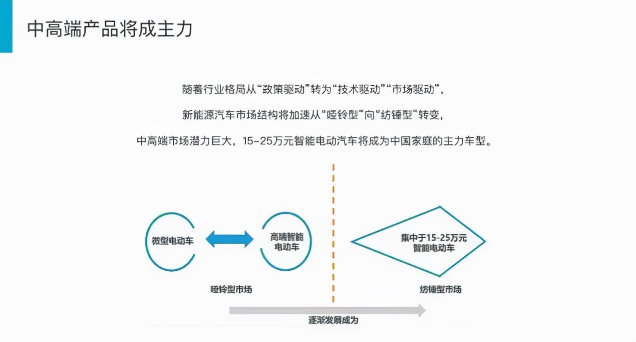 除了新能源汽车销量不断走高,市场进入爆发式增长阶段,其结构也悄然发生着变化,尤其是乘用车市场正在从“哑铃型”向“纺锤型”转变,即中高端市场需求逐步放大,因此15万元-25万元价格区间的产品迎来了前所未有的春天。