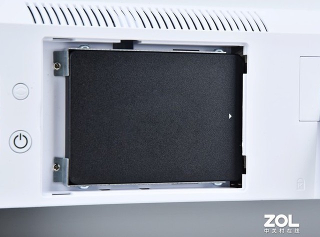 这款一体机点睛之笔是在SATA硬盘处做了模块化的设计,位于电源按钮旁边的硬盘盖能够轻松扣开,非常方便进行更换和升级SATA硬盘。