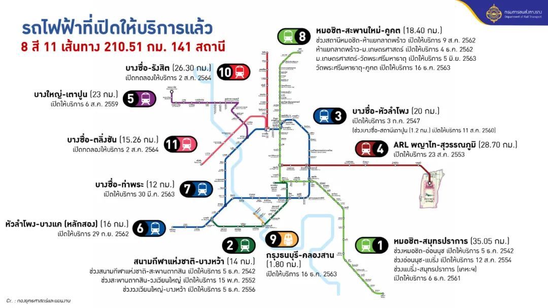 红色线一期和二期的开通使曼谷及周边地区的轨道交通线路运行总长度达到210.51公里,包括11条线路141站,详细如下: