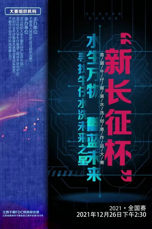 在当前牛仔产业国际大发展的新趋势下,牛仔洗水领域更需要一代具有国际视野的新的优秀洗水师队伍。美丽的于都曾经是中央红军长征出发的集结地,现在已经成为了赣闽粤时尚新城的后起之秀,中国牛仔产业又一新的集群地,“新长征杯”全国牛仔水洗创意作品大赛由于都县人民政府、武汉纺织大学于都牛仔产业研究院、国家纺织行业牛仔服装先进制造重点实验室联合发起,成为连接牛仔洗水人才与牛仔市场的桥梁。通过科技、文化、艺术与时尚的深度融合,体现未来牛仔产业的生态可持续发展理念,展示洗水师们天才的设计创意灵感与高超先进的洗水技术。