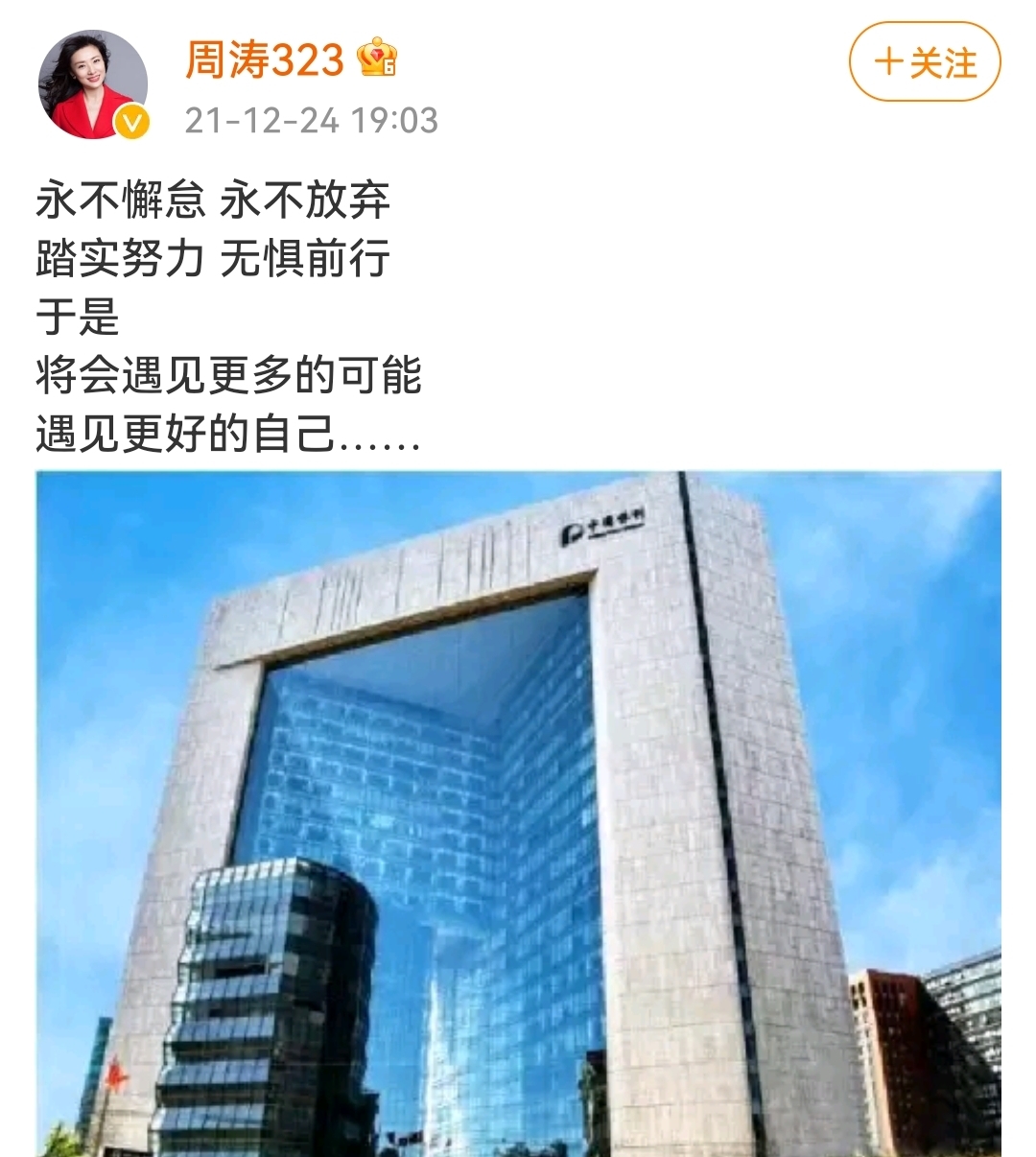 “永不懈怠永不放弃,踏实努力无惧前行。于是,将会遇见更多的可能,遇见更好的自己…… ”24日晚,前央视著名主持人周涛发文,并配上一张写有“中国保利”的大楼图片。