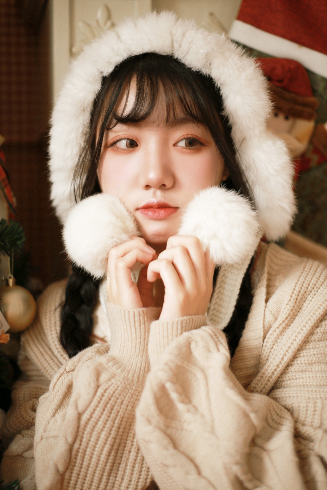 很多人喜欢拉近距离拍摄大头照,但这需要极强的人物表现力。普通人表现力大部分不足,但咱们可以借助道具帮忙,圣诞帽加身,双看不看镜头,拒绝尴尬和不自然的同时,表现力和氛围感也拉到了极致~