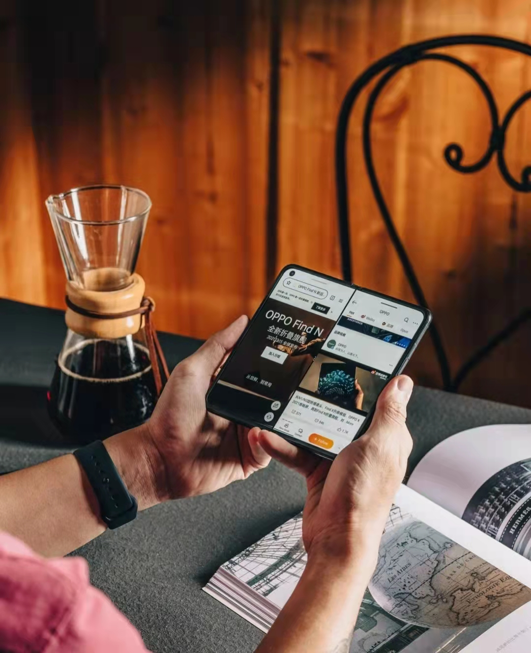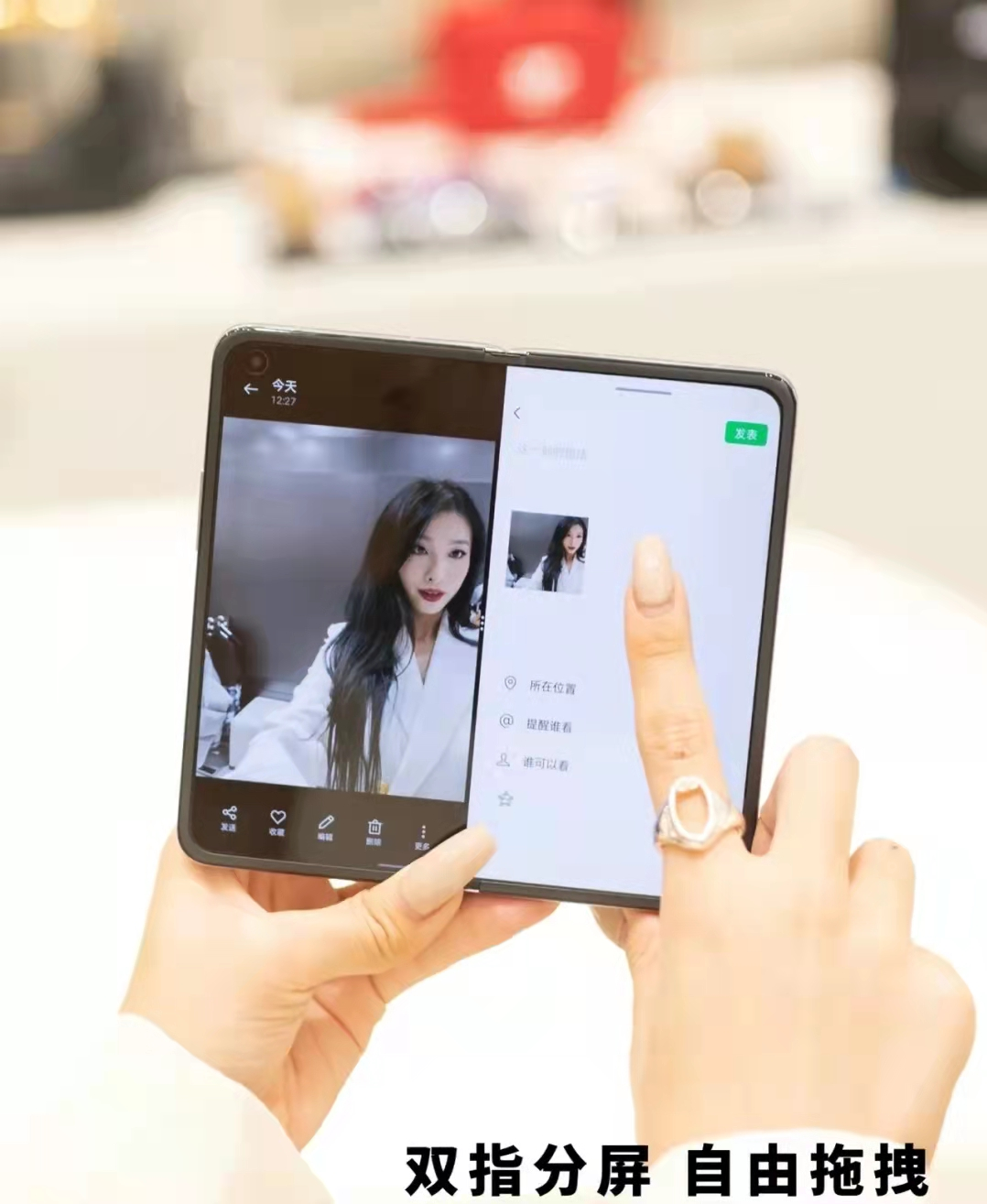 如果能让大家一边预览一边拍摄呢?Find N双面屏的设置,实现了拍摄人像和预览画面同时进行,这样我们就能随时随地了解自己在镜头中的状态,调整好自己的表情、动作等等。