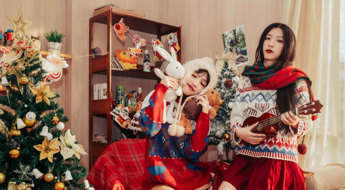 节日聚会必不可少,与好友圣诞合照也是技术活。想要突出你们的友情和圣诞的氛围感,最好服装色调统一,背景不要太乱,否则会影响画面协调感,动作可以稍微夸张一点,拍出来冲突性和趣味性也更强一些。