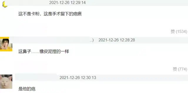 但从这随随便便一场讨论就上千的点赞看,王一博真红啊……不是,王一博鼻子争议真大啊,应该是从他走红之后就没停过,动不动就有人觉得他鼻子疤痕又暴露了,包括他的窄长脸,以及与年龄不是很相符的法令纹,都曾经是某些自认专业人士嘴里的证据。