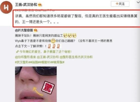 也有另一位自称是整容医生的博主,在列举娱乐圈动了鼻子的男星时,把王一博计算在内了,话术和其他博主也差不多,但另外提到了后遗症的问题,比方说法令纹啊、显老啊、脸垮啊之类的。