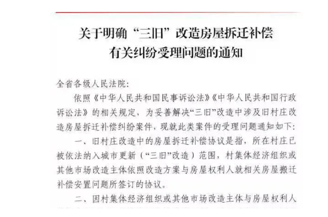 为妥善解决“三旧”改造中涉及旧村庄改造房屋拆迁补偿纠纷案件,就此类案件的受理问题,广东省高级人民法院于日前发布了《关于明确“三旧”改造房屋拆迁补偿有关纠纷受理问题的通知》,文件号为(粤高法〔2021〕126号),以下简称《通知》。《通知》解读如下:1.【仅涉及旧村庄改造】《通知》中明确为解决“三旧”改造中旧村庄改造的房屋拆迁补偿纠纷案件受理问题,因此,旧厂房、旧城镇改造案件并未适用,但按照一般习惯,类似情况可以参考适用,尤其集体土地(旧村庄)上的旧厂房改造。2.【民事案件受理】因村集体经济组织或其他市场改造主体与房屋权利人签订的房屋拆迁补偿协议所引发的纠纷,属于《最高人民法院关于修改〈民事案件案由规定〉的决定的通知》(法〔2020〕347号)中规定的“民事主体间房屋拆迁补偿合同纠纷”,作为民事案件受理。法〔2020〕347号是在2021年1月1日施行,此前并无该项案由,而是“房屋拆迁安置补偿合同纠纷”。另外,该处规定与《广东省高级人民法院司法建议书》(粤高法建〔2012〕15号)有关内容相对一致:在“三旧”改造中,无论采用何种形式进行征收或征用,当事人争议的本质往往是拆迁补偿问题,对于此类纠纷,如当事人达成拆迁补偿协议后,因协议的效力、履行等发生争议的,属于平等主体之间的民事法律关系,人民法院可以作为民事案件受理;当事人未达成拆迁补偿协议的,人民法院不能作为民事案件受理……