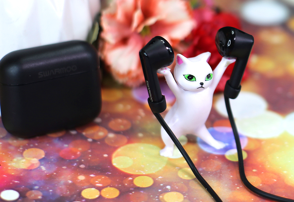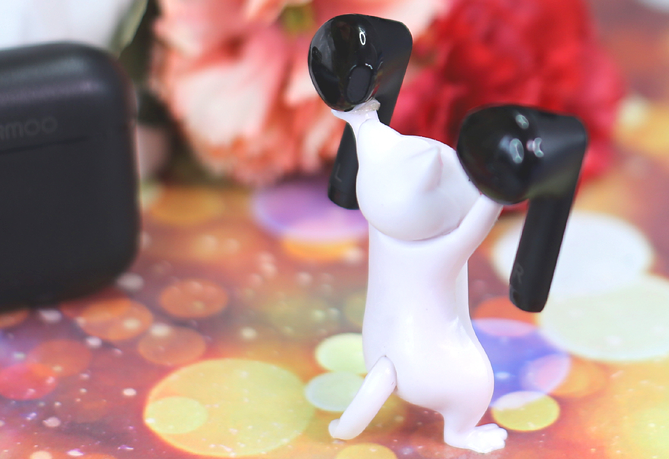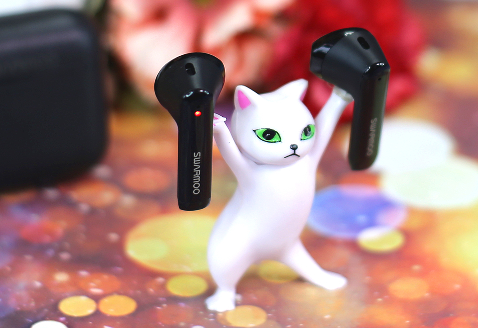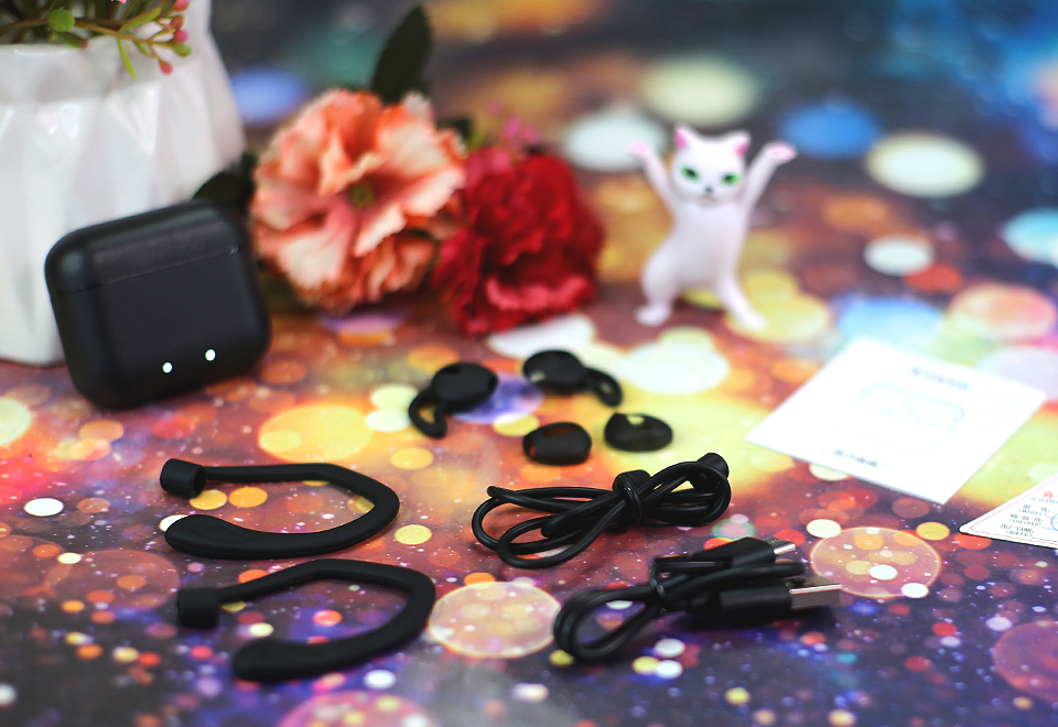 除了包装盒子以外,还带有一盒运动套件组合,一起拆开后可以看到配件十分丰富,传统的说明书质保卡,一根C插口的充电线路,充电仓,以及主打运动的硅胶牛角耳帽、硅胶防滑耳帽、硅胶运动耳挂和硅胶运动绳。还有一个可爱的猫猫摆件。不到200这配置?!笔者也忍不住感叹良心国货!
