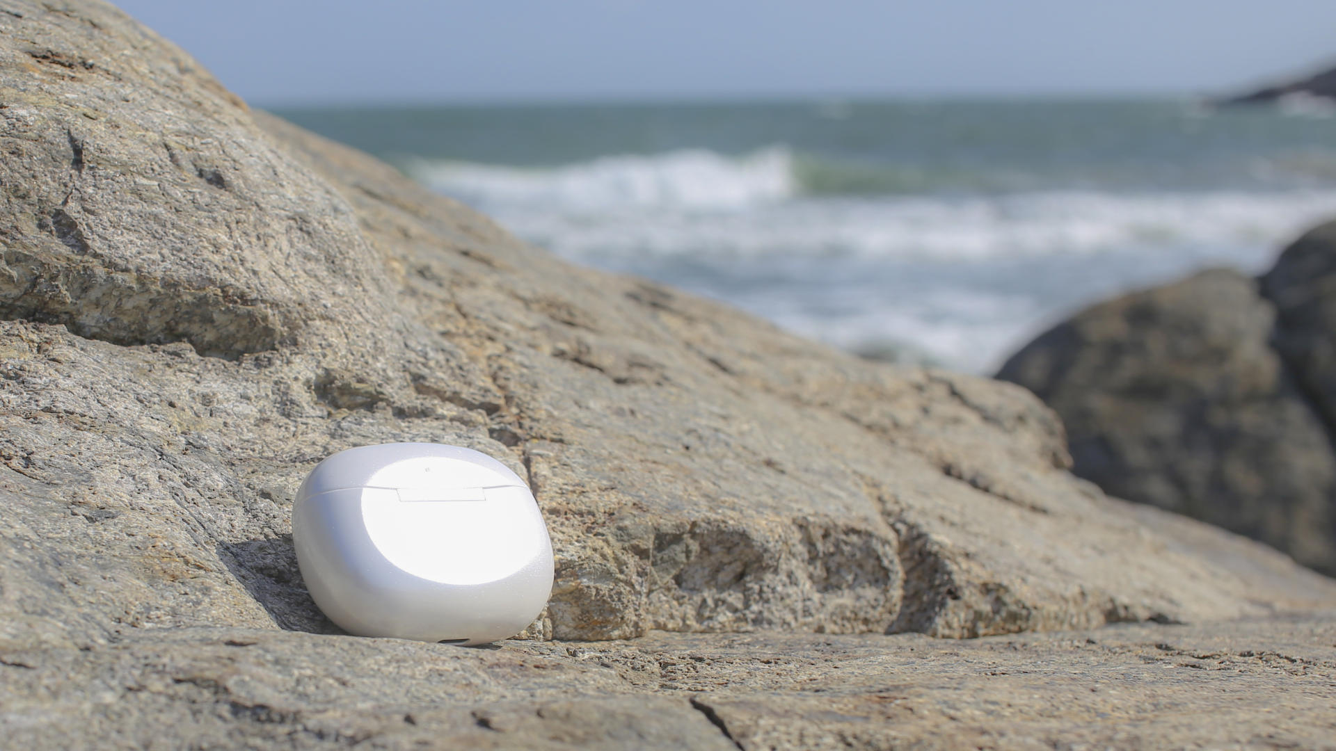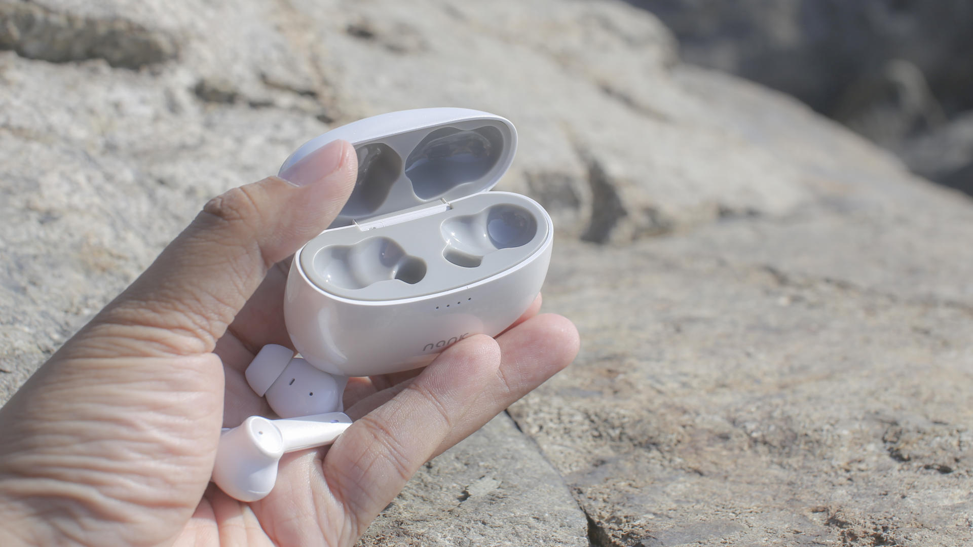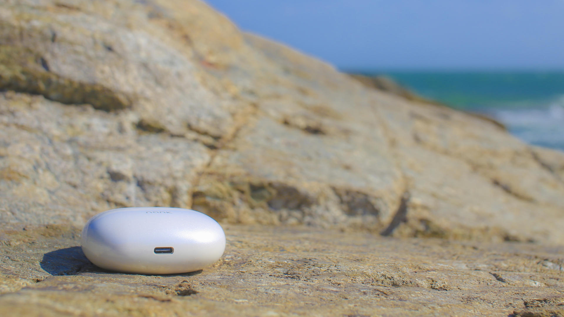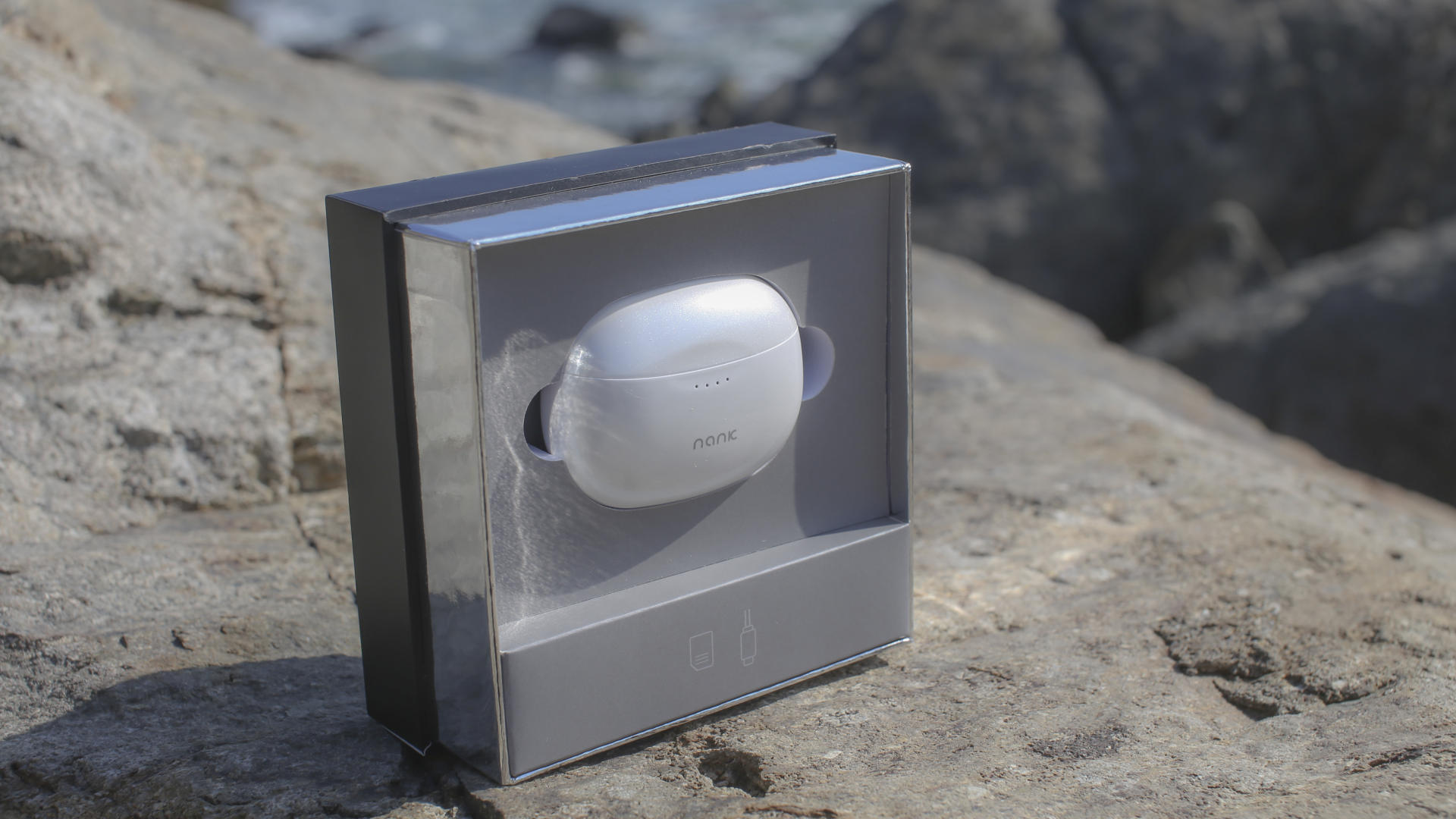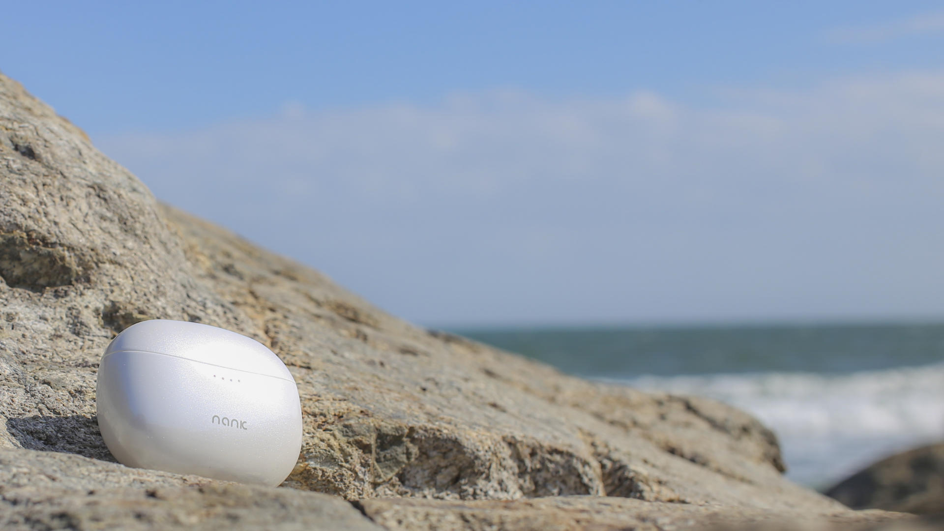 南卡A2主动降噪蓝牙耳机的充电仓,采用的是简约设计风格犹如珍珠,显乳白色,类似椭圆体的不规则主体,设计时尚,收纳性也较好。充电仓正面正中可以看到南卡的logo,并且在其上还有四个led指示灯。在这海边真的犹如一颗大大的珍珠。