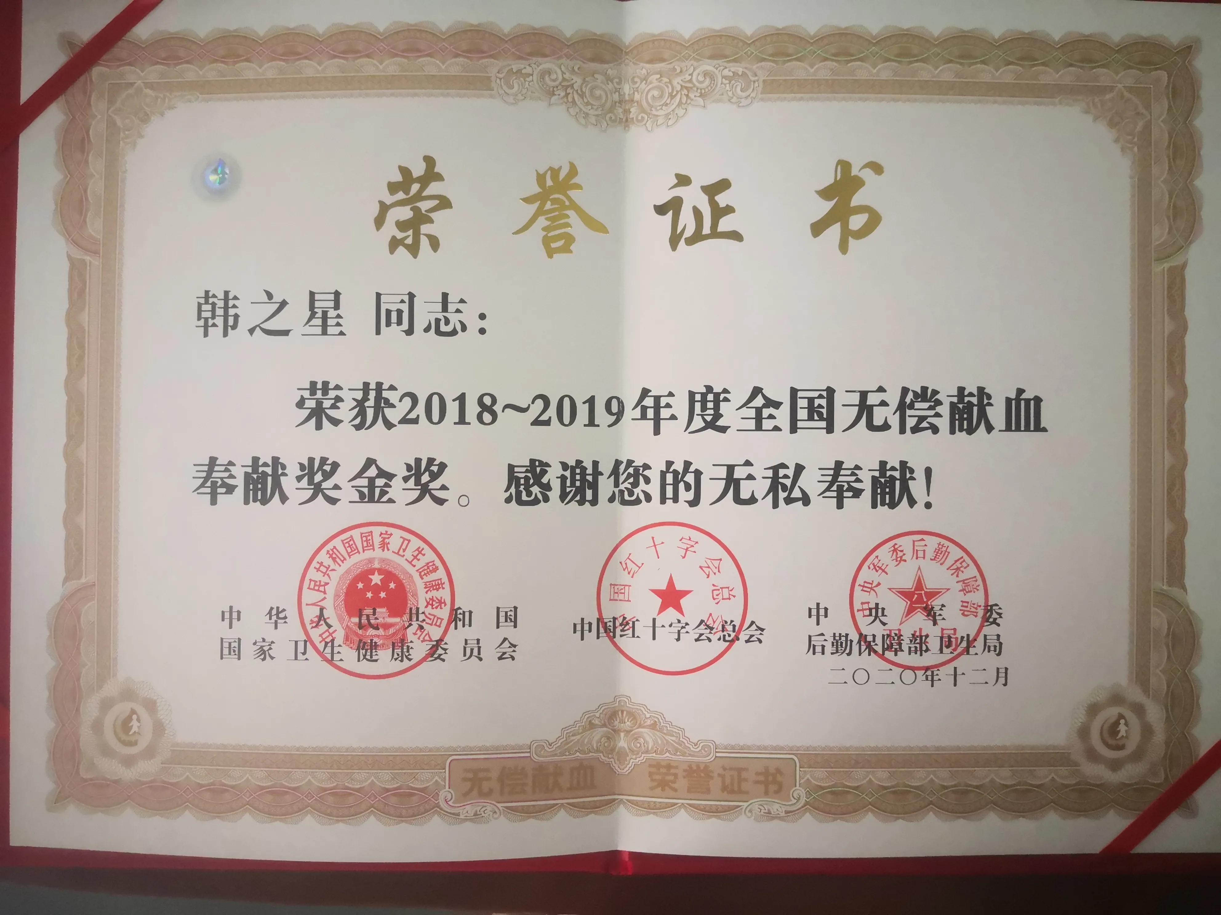 红五角行动发起人韩天杰荣获全国无偿献血奉献奖金奖,韩天杰曾用名,本名韩之星,笔名北极君,山东省滕州市人。