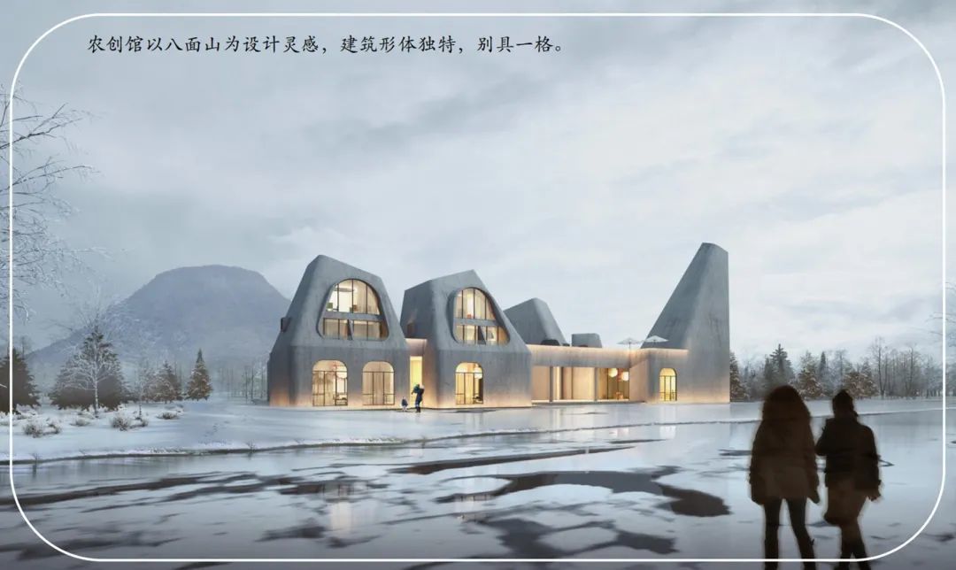 农创馆的建筑形体设计灵感来源于八面山,内部设置农产品展示、直播培训学院、农业创客工作室、餐厅、书吧、民宿等功能。