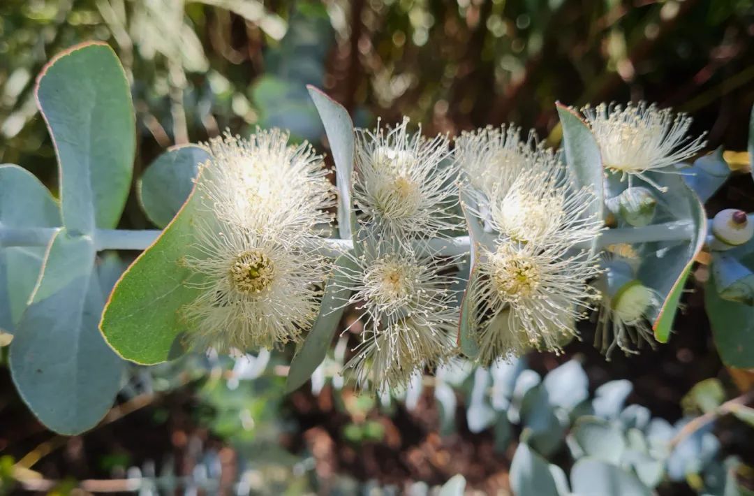 上面是银叶山桉(圆叶桉)的花朵,很有桃金娘科的特点