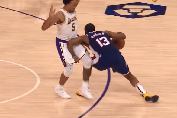 本场比赛进行到末节,篮网后卫詹姆斯-哈登持球,在进攻中哈登手肘打到湖人球员塔伦-霍顿-塔克的裆部,后者痛苦倒地。值得一提的是,在塔克倒地后,哈登还踩到了前者的手。