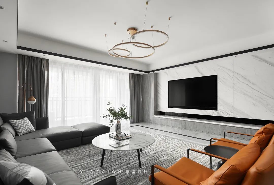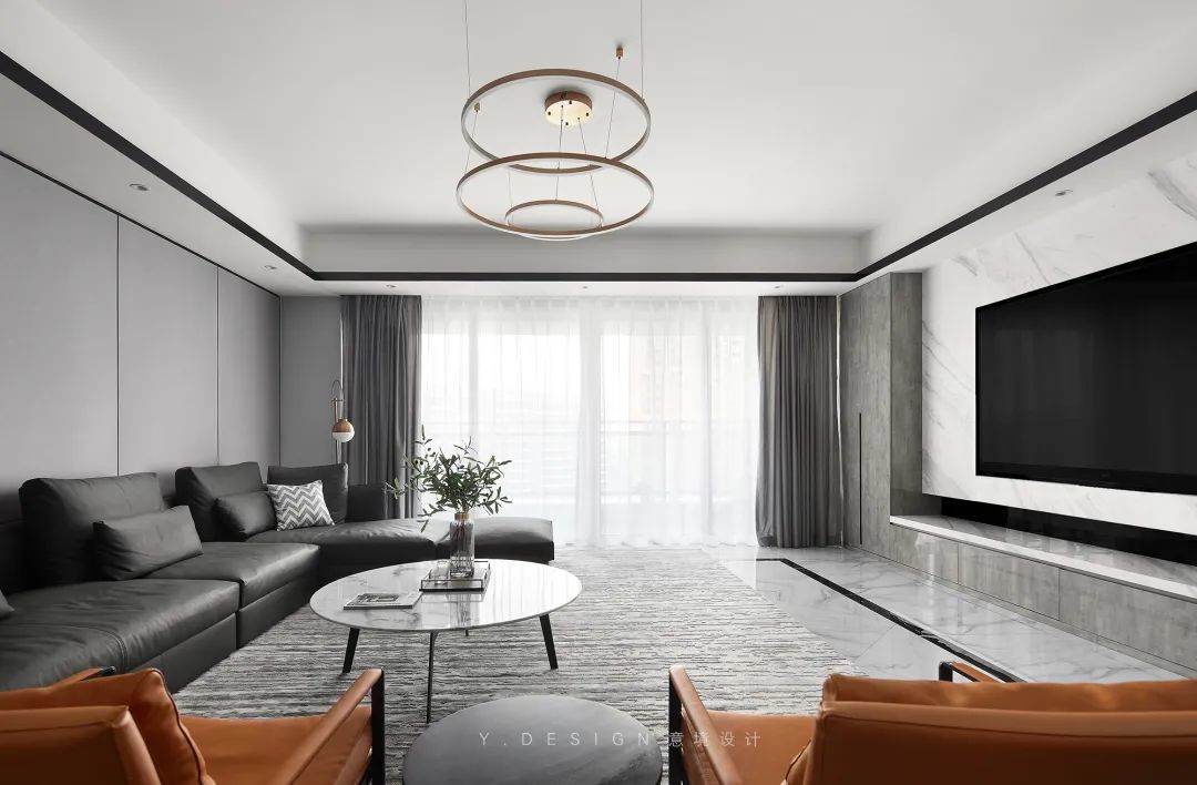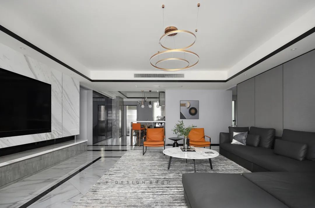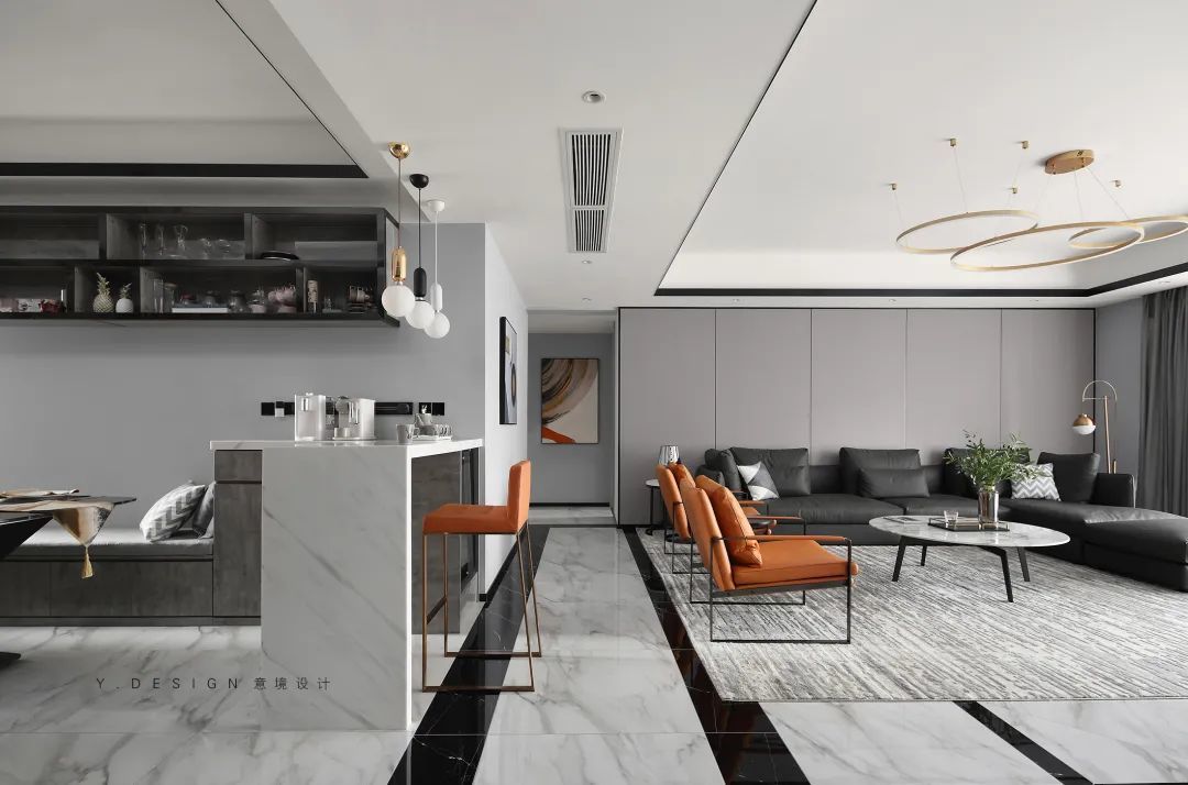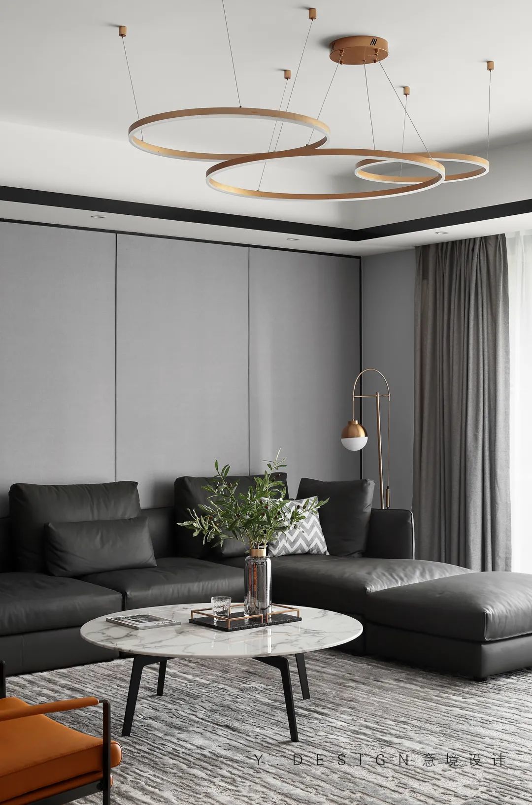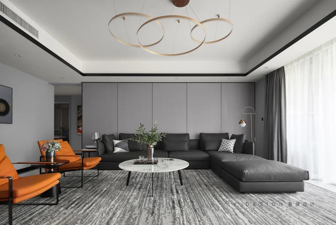 ▲沙发墙是灰色的硬包背景墙,布置深灰色的皮沙发,结合白色岩板茶几,天花上装一组金属环吊灯,左侧布置两盏橙色沙发椅,让空间显得低调优雅而又华丽高级。