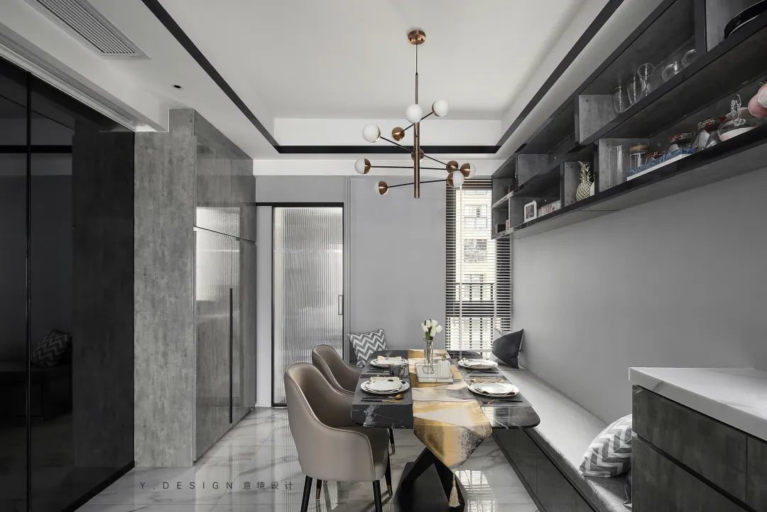 ▲餐厅在白色地砖的基础,加入灰色的墙面与定制柜,还有高级黑色的吊柜与墙面,黑白灰的空间搭配,布置上一张黑色岩板餐桌,结合卡座与卡其色皮艺餐椅,营造出一种端庄精致的用餐氛围感。