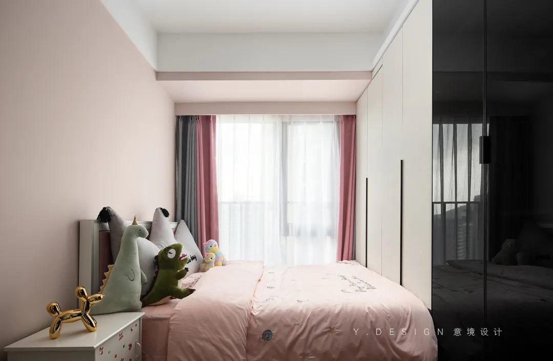 ▲儿童房以淡粉色的墙面空间,布置粉色床与窗帘、还有可爱的公仔与抱枕,呈现出一种浪漫舒适的公主范,床尾的黑色+白色衣柜组合,黑色部分的衣柜是黑色亮光的设计,也营造出一种时尚大方的黑白配设计感。