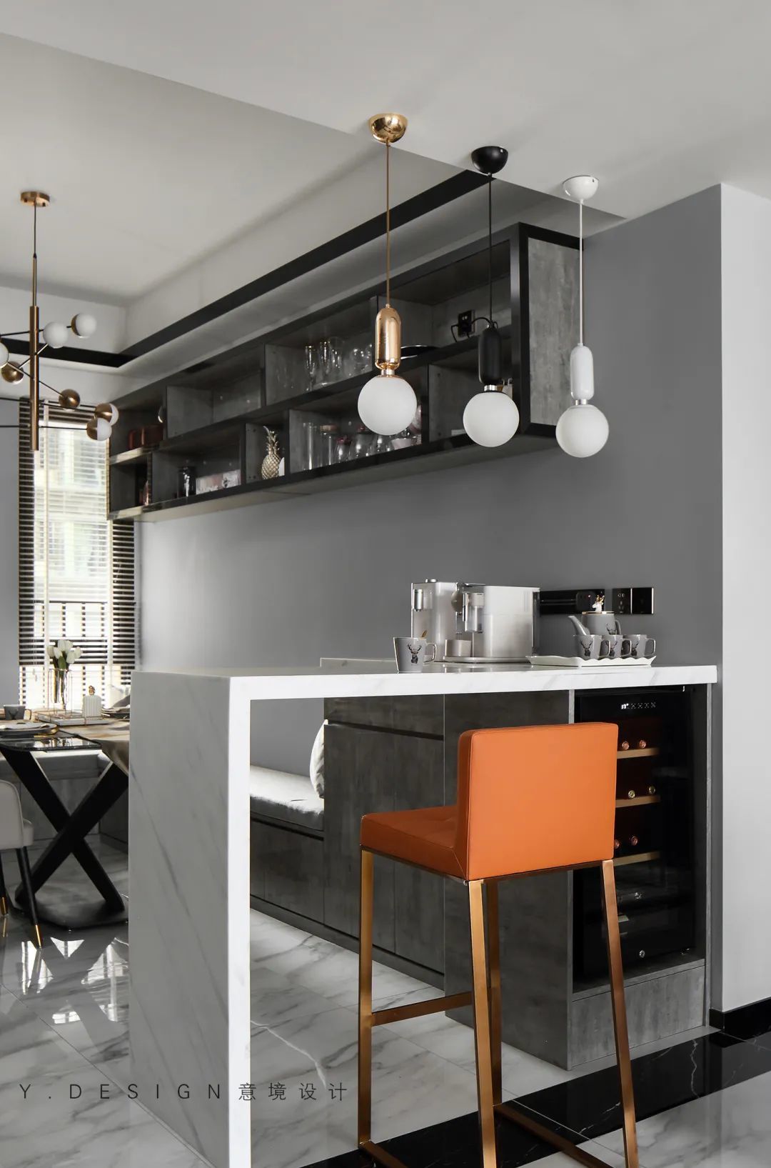 ▲吧台连着餐边柜、卡座一起设计,吧台下方加入酒格架,白色大理石+橙色金属脚架的皮艺吧椅,结合吧台上方的金-黑-白三色组合的吊灯,营造出了一个情趣优雅的品酒休闲空间。