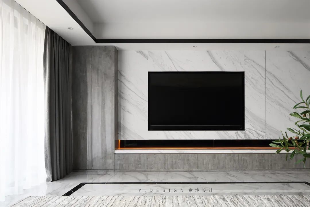 ▲电视墙左侧与底部是灰色的定制收纳柜+抽屉,整个背景墙以雅白的岩板为背景墙,加入壁挂电视机,并在电视柜台面与大理石之间加入暗藏灯带,使得整个电视墙更加优雅层次。