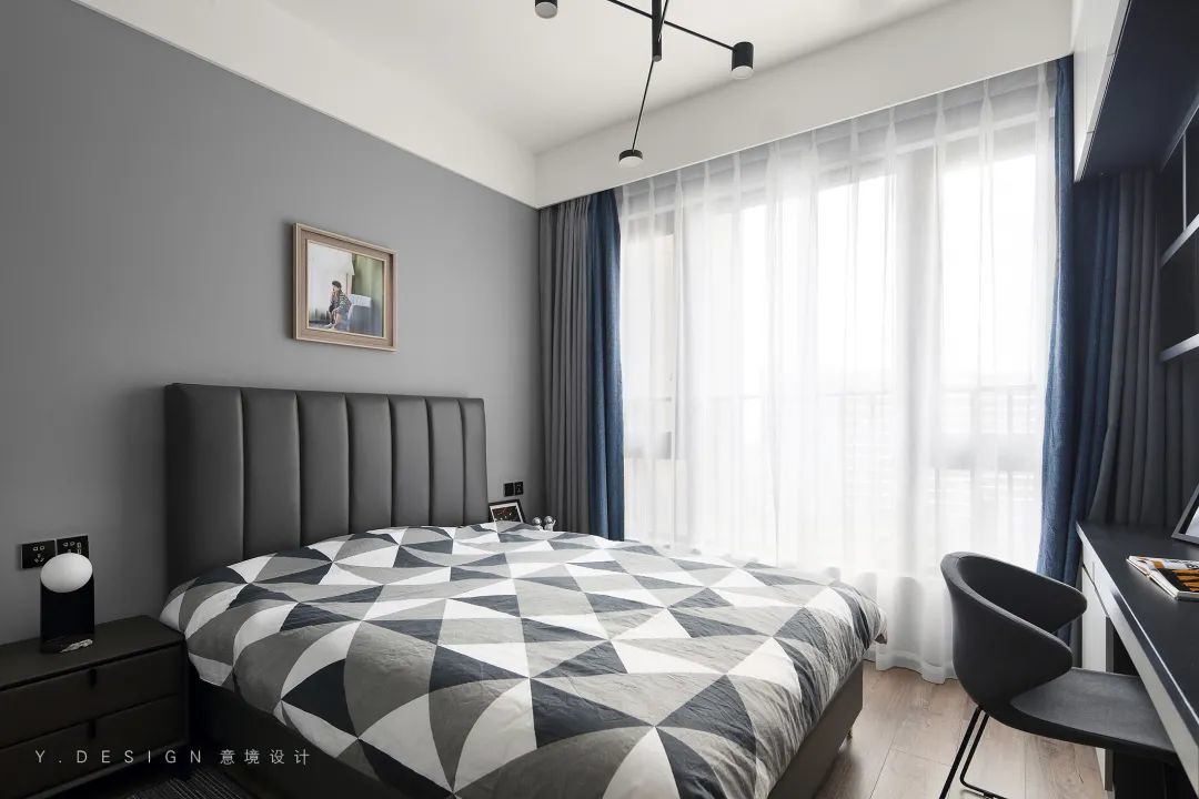 ▲卧室床头墙是灰色的乳胶漆背景墙。布置上黑色的皮艺床、铺上三角格纹的床单,加入蓝灰配的窗帘,带来一个简约安静的卧室空间;床尾区布置黑色定制书桌,提供了一个休息与工作兼具的卧室空间。