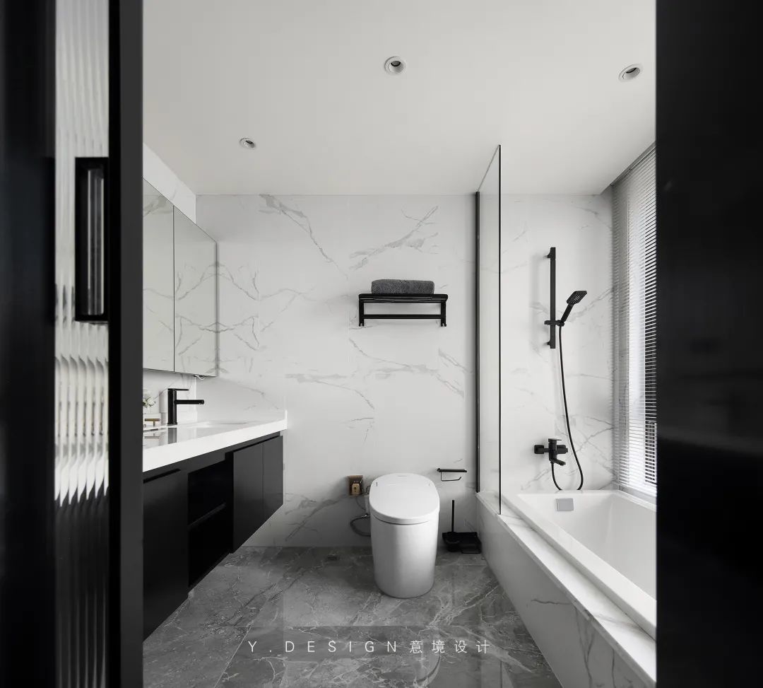 ▲卫生间以灰色地面+白色墙面的空间,加入黑色洗手盆柜,靠窗装一个大浴缸,加上黑框的长虹玻璃门,营造出一个时尚优雅的卫浴氛围。