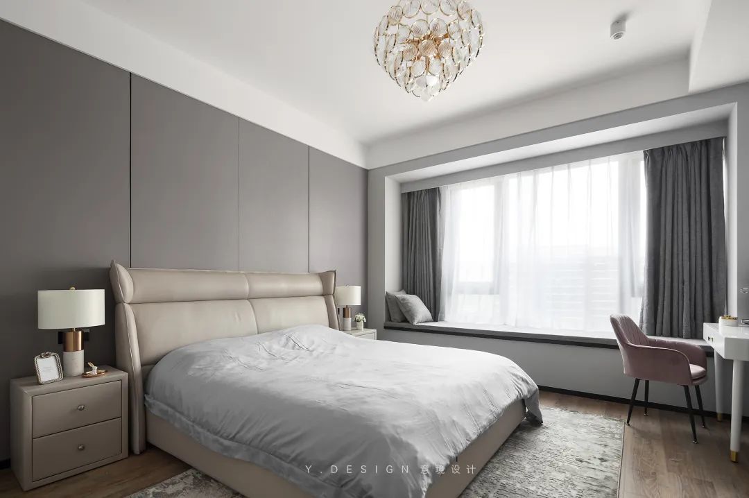 ▲主卧床头墙是灰色的硬包,在米白色皮艺床、灰色的床单、地毯与窗帘等简约优雅的软装布置下,床尾布置梳妆台+粉色椅子组合,天花装一盏轻奢质感的水晶吊灯,让卧室空间显得华丽优雅而舒适自然。