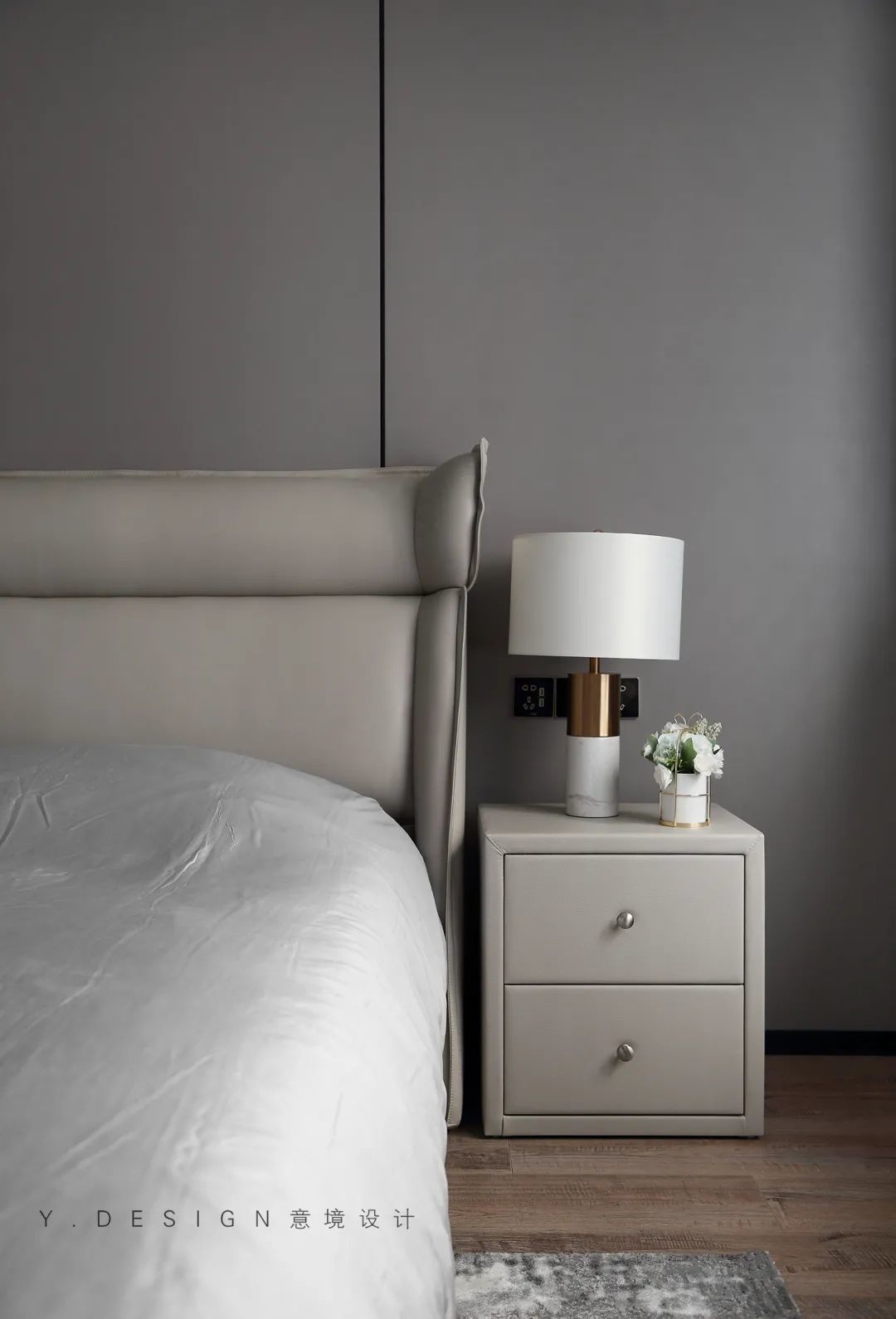 ▲床头旁边的皮艺床头柜,布置上精致的台灯与小花瓶,也增添了卧室空间的精致与现代气质。