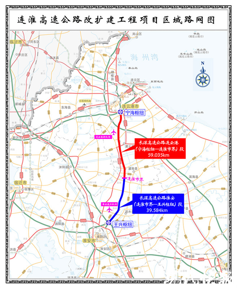 长深高速公路扩建工程连云港段,起自连云港市海州区宁海枢纽北,经海州区、灌云县、灌南县,止于灌南县与淮安市涟水县交界处,全长约59.02公里,概算总投资约102.3亿元。全线由双向四车道扩建为双向八车道,设计时速120公里/小时,建设工期三年半。“这条高速公路改造以后,对连云港向淮安、南京的南向通道扩容、增速起到很大作用,路面拓宽以后,交通更通畅、流量更大,老百姓的出行也更加方便快捷。”毛善通说。