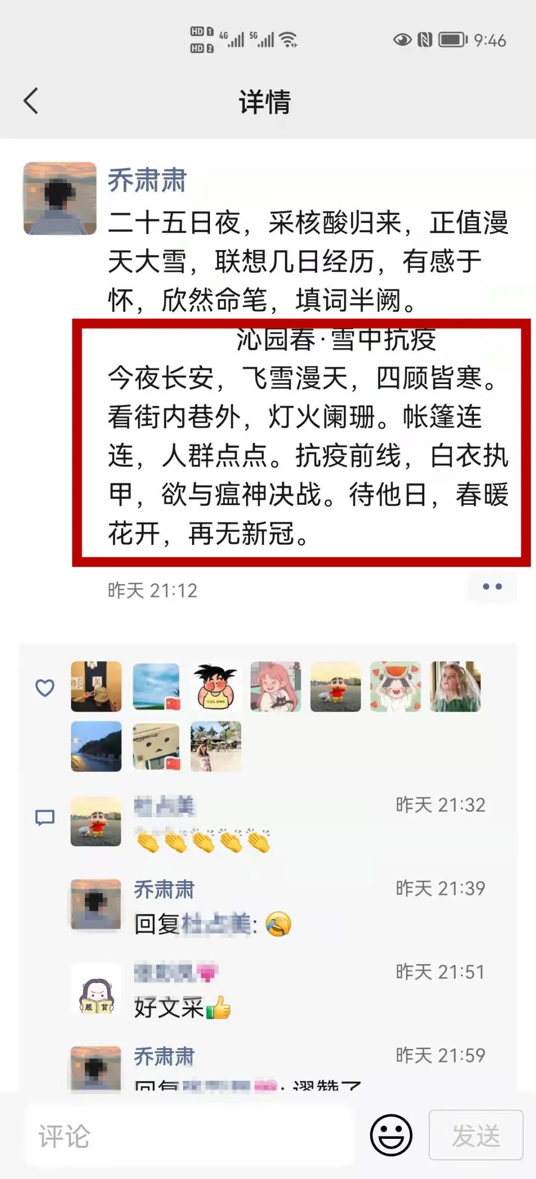 他的诗句里写到:“......此疫必除,待山花烂漫,春日盎然,抗疫必胜。彼时我八百里秦川,一片峥嵘,熙熙攘攘,忙忙碌碌,再与万千争雄。”