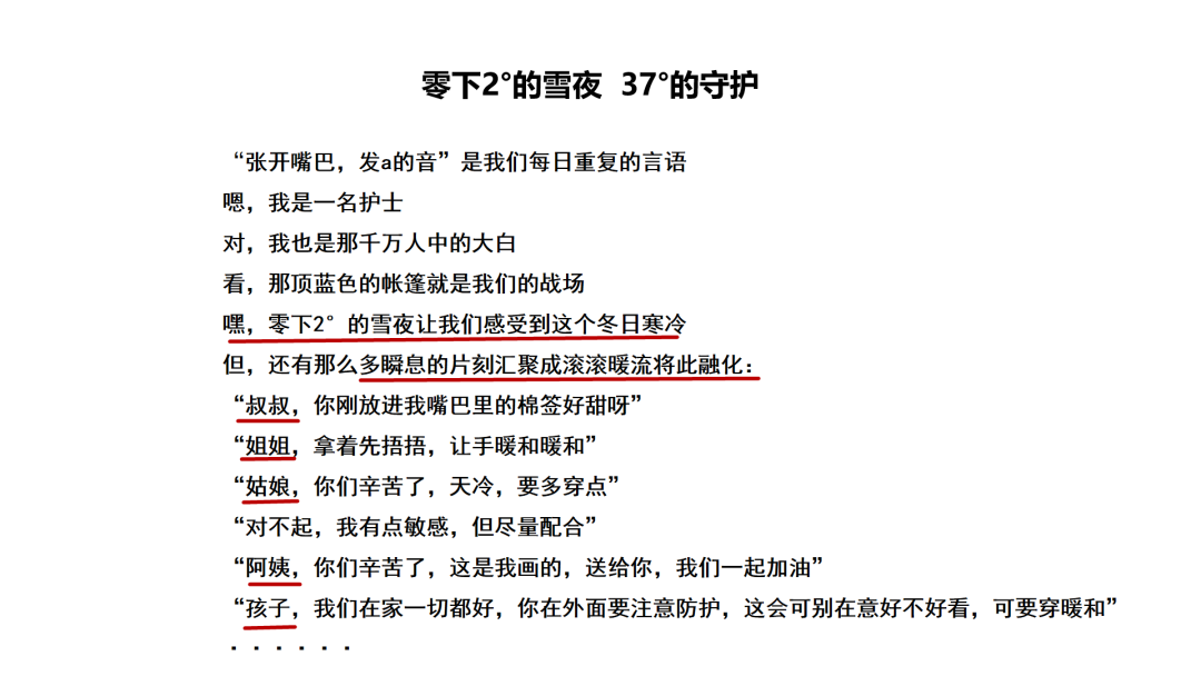 支援一线白内障人工晶体中心的孙婕,也是在休息时间,专门借电脑书写自己在雪夜采集核酸的感受《零下2°的雪夜 37°的守护》,希望用自己的行动温暖这座城市。