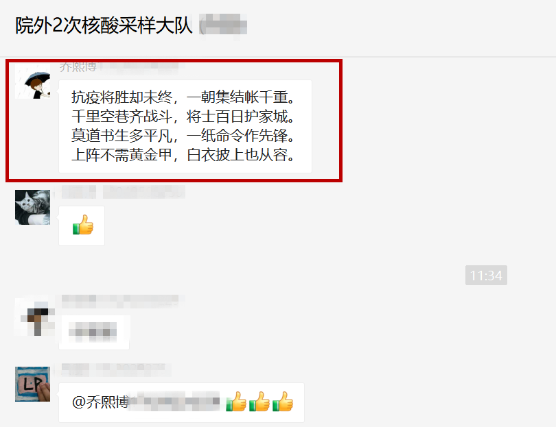 支援浐灞地区核酸采样队群里,休息时间里,大家也用诗句互相鼓励,这里不说年岁、不分科室、只有期盼。超声科今年6月份刚入职的乔熙博,这是他第三次参加核酸采样工作,8月份开始院内采样、10月份去院外采样,这一次他又来了。原因很简单:“科室男同志少,我算一个”。