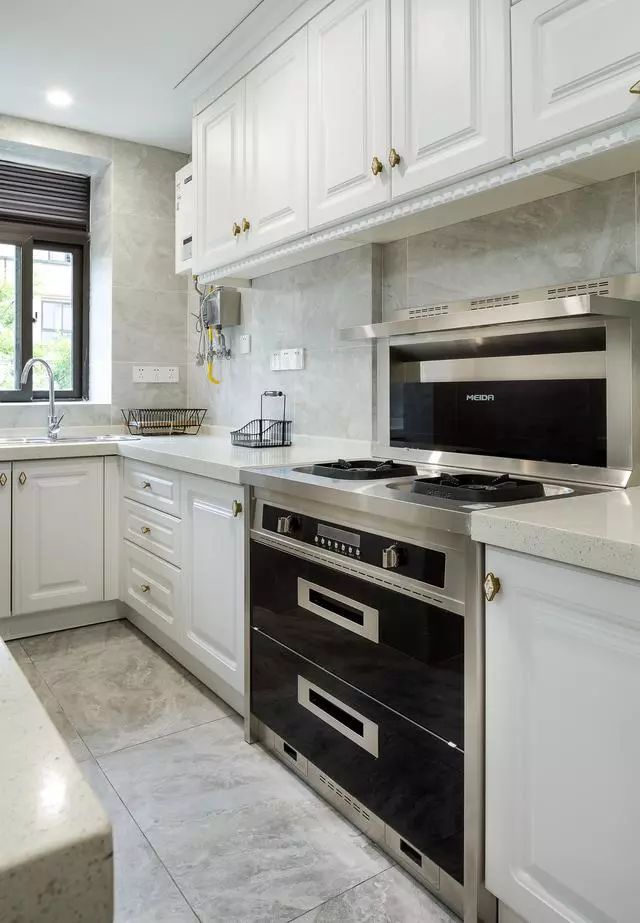 白色橱柜配上金色把手,看起来很有质感,而且显得也很有档次~还有灰色砖的铺贴视觉效果也是很不错的~