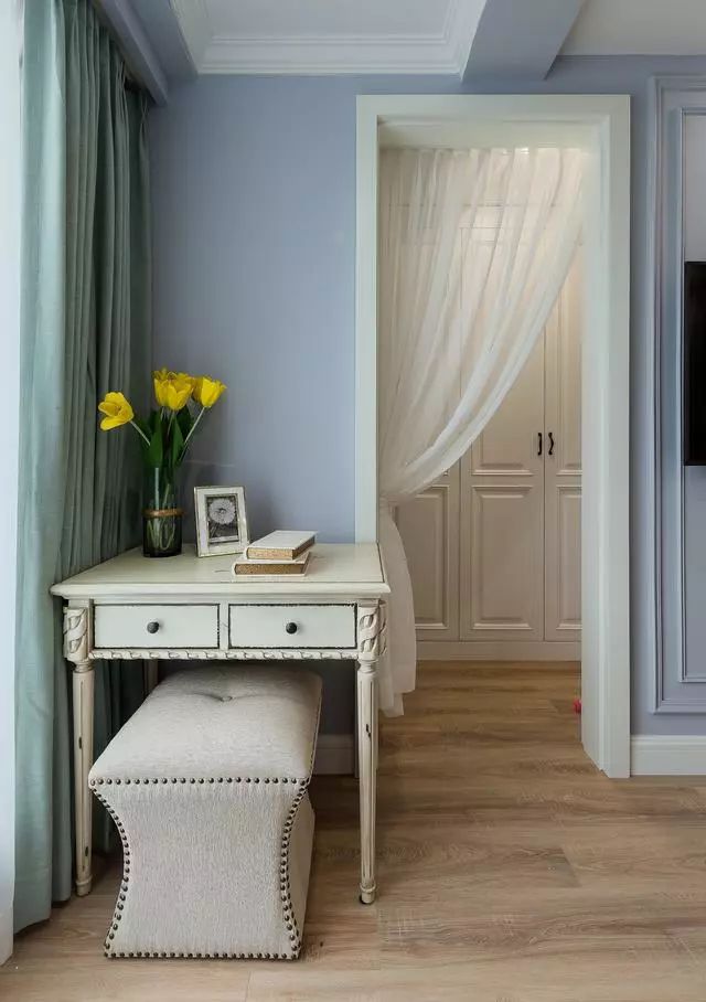 而且主卧还带一个独立的衣帽间呢~这里没有安装门,而且是白色的纱帘进行装饰,效果很不错吧~