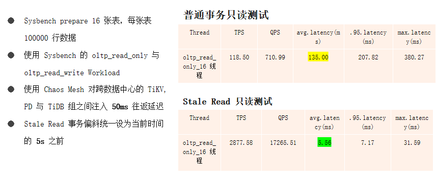 另一个使用场景是跨数据中心的就近读:降低跨数据中心的读延迟,请求可以通过就近原则选择副本进行读取。使用Chaos Mesh混沌工具模拟跨机房50毫秒延迟,然后设置允许5秒的延迟读,在 oltp_read_only 16线程的场景下对比普通事务只读与Stale Read 只读,从结果来看,latency 从135 毫秒降低到 5.56毫秒。