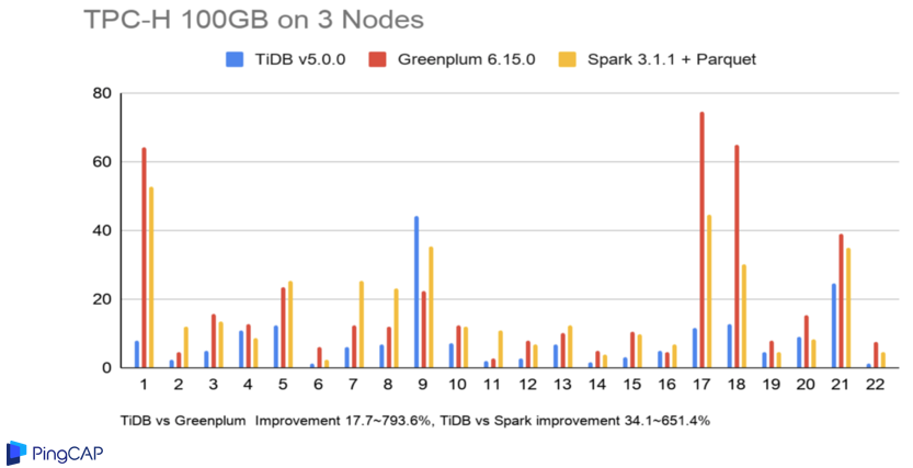 对比 TiDB 5.0 MPP 模式下和主流分析引擎例如 Greenplum 和 Apache Spark 最新版在 TPC-H 100 下的性能表现。从结果来看,TiDB 5.0 MPP 模式下相对这些方案有 2-3 倍的性能提升,部分有高达 8 倍的提升。另外在TiDB 5.3 版本优化了 MPP 计算引擎,支持更多的 字符串/ 时间和其他函数/算子下推到 MPP 引擎。