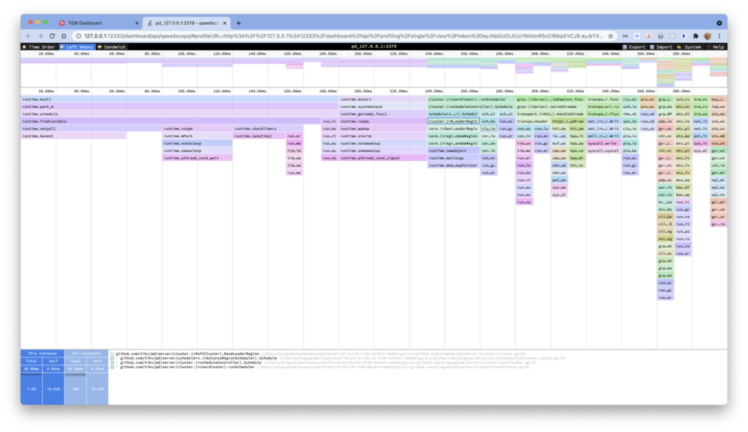 Continuous Profiling支持TiDB、TiKV,暂时不支持TiFlash,正在开发中。收集到的性能数据可显示为有向无环图,直观展现实例在性能收集的时间段内执行的各种内部操作及其比例,方便用户快速了解该实例 CPU 资源消耗细节,像右边这张火焰图的展示方式会在5.4版本正式支持。另外,开启该功能的性能损耗大概为 0.5%。
