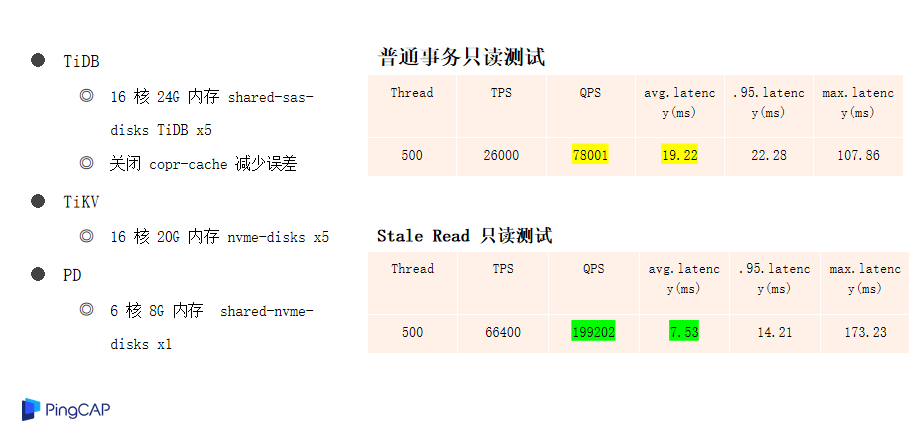 第一个场景是:扩展读的能力,为表扩展多个副本,每个副本提供读, 缓解读热点的压力;这是一个测试小表的场景,测试环境配置如左边所示,使用 sysbench 压测单表,prepare 10k 数据,需要注意的一点的是:这张表在TiKV的存储只有一个 region,在500个线程的workload情况下对比普通事务只读与Stale Read 只读,从结果来看,latency可以从原来的19毫秒降低到7毫秒。
