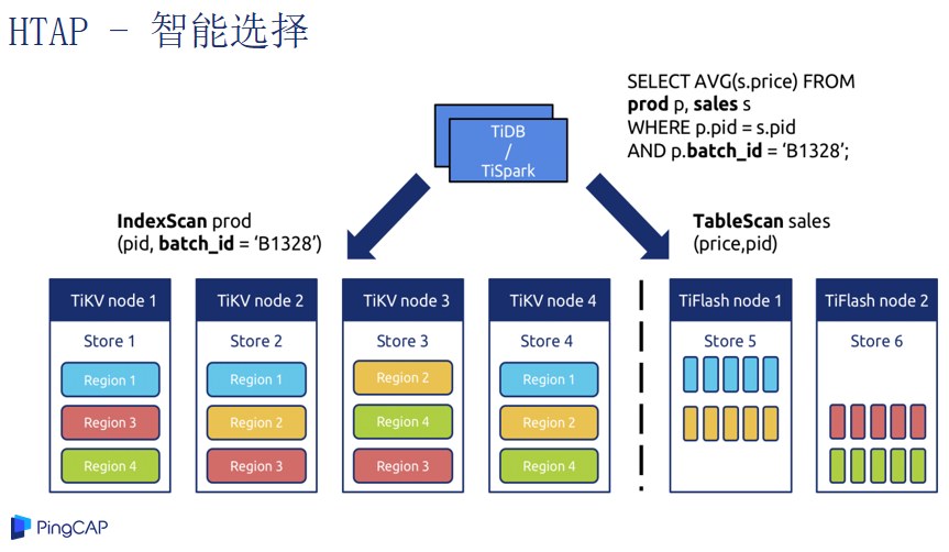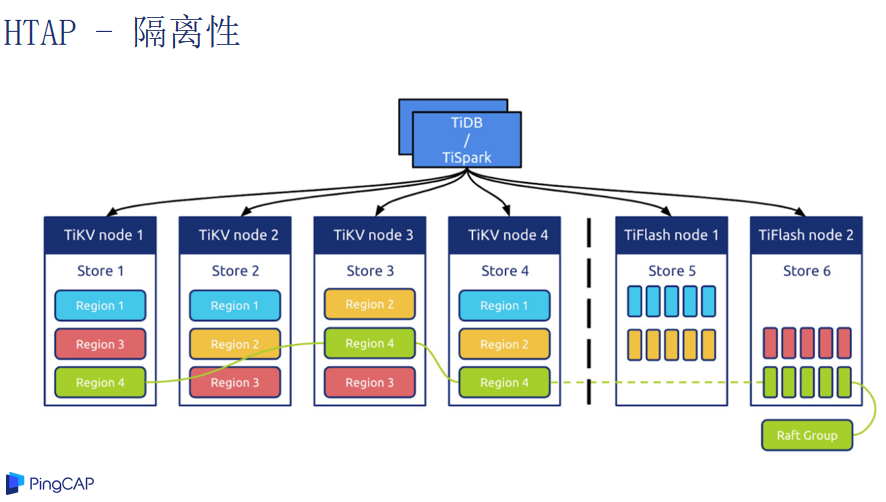 HTAP需要在TP跟AP类进行数据的查询,要做不同数据存储,TiDB采用的方式是隔离列存跟行存进行分开,进行AP类查询时不会影响TP业务的性能,可以在底层物理存储时把AP跟TP类进行分开部署,这样也能达到物理资源上的隔离。