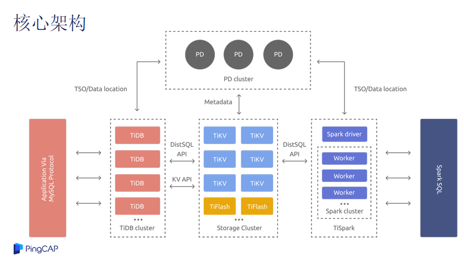 TiDB 是一个计算存储分离的分布式数据库,核心架构由4大组件组成,分别是:TiDB cluster、PD cluster、Storeage cluster、TiSpark,其中Storeage cluster又可以分为TiKV和TiFlash。
