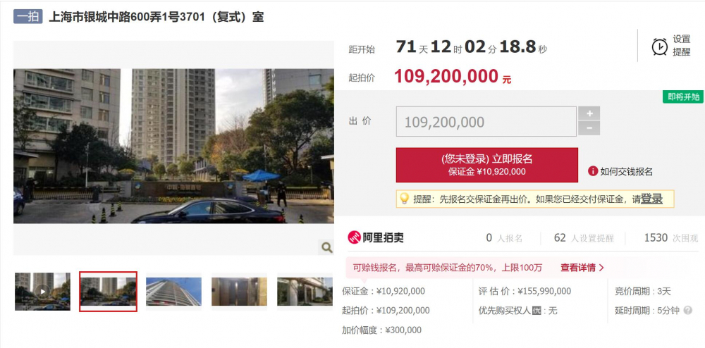 2022年3月8日至3月11日,上海市普陀区人民法院将在淘宝网司法拍卖网络平台上,对上海某有限责任公司名下的上海市银城中路600弄1号3701(复式)室进行公开拍卖,起拍价为1.092亿元,折合建面每平方米约18.4万元。