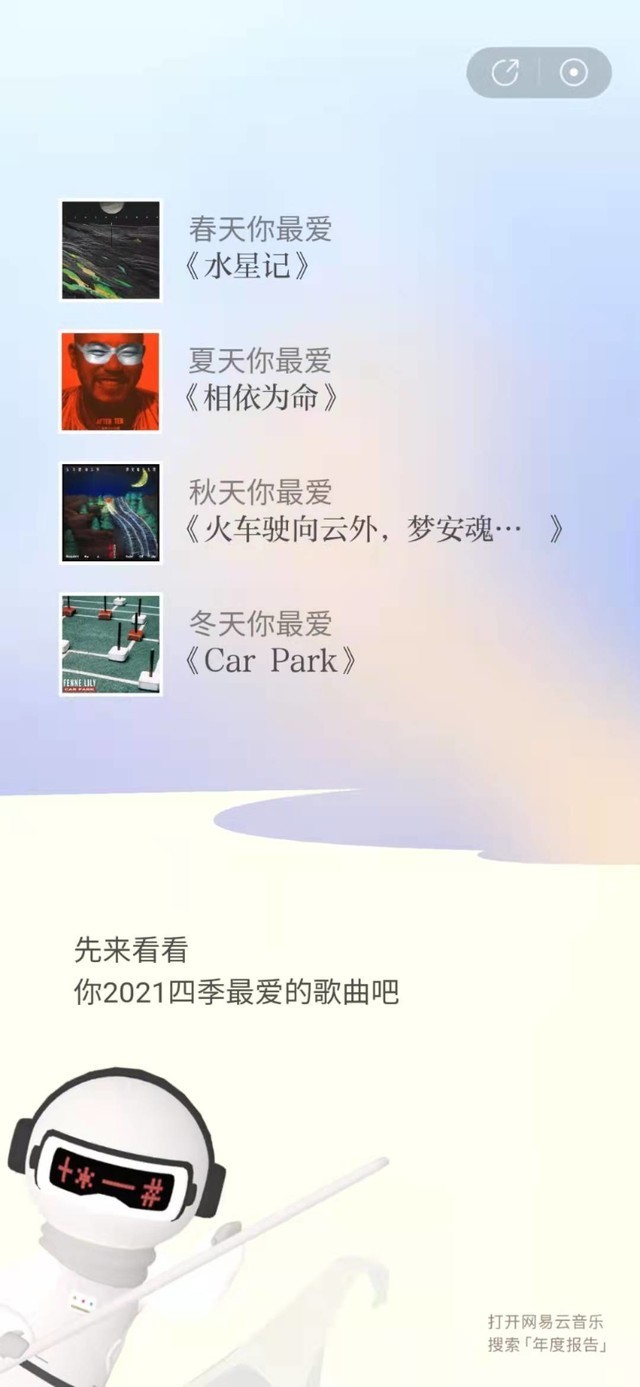 网易云音乐的年度报告可在App首页直接查看,本年度的报告相对比较长,包括选择形象,四季歌单,最喜欢的歌手和年度听歌榜等内容。