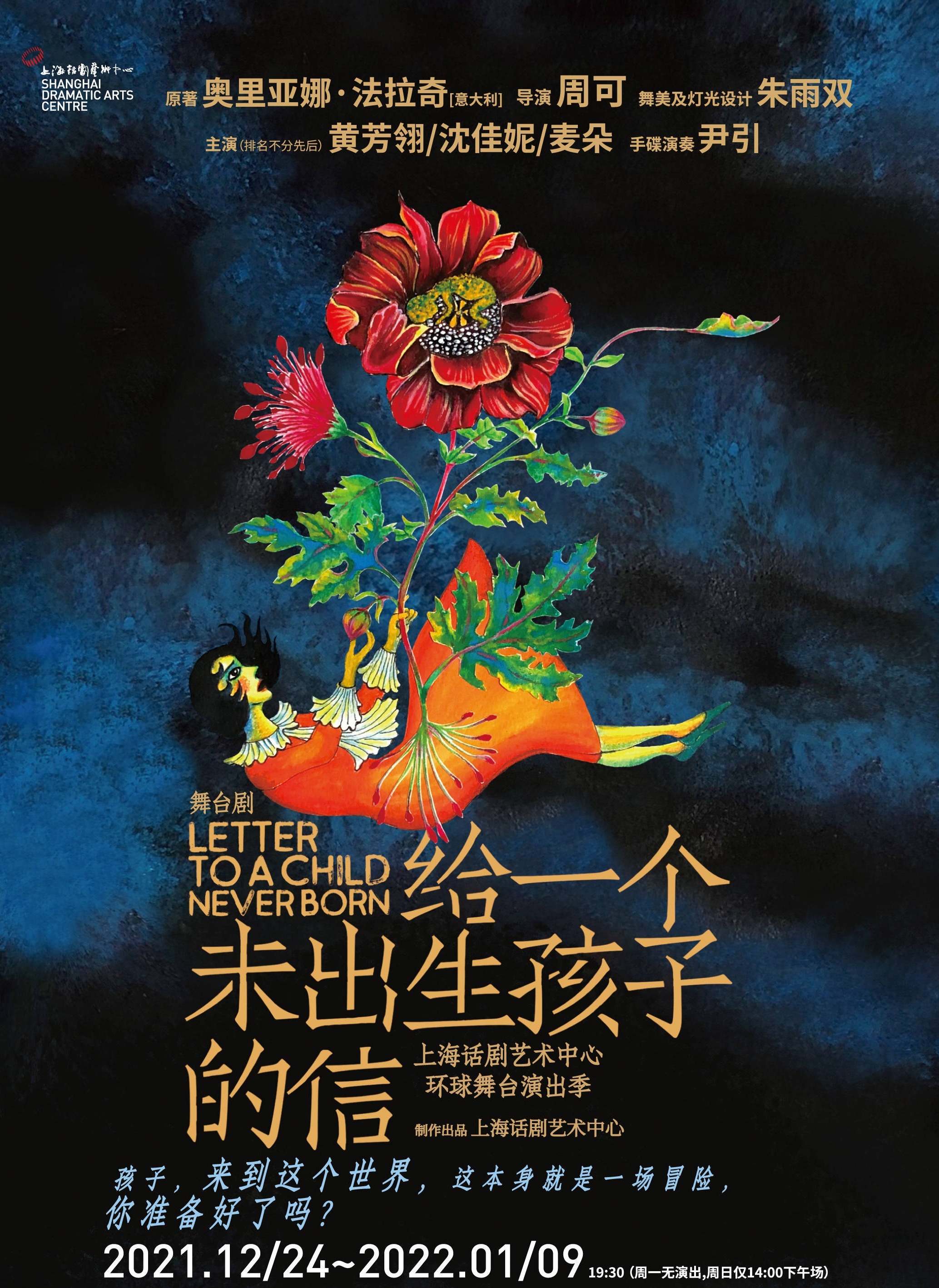 上海话剧艺术中心·环球舞台演出季剧目,根据意大利著名记者、作家奥里亚娜·法拉奇同名小说的舞台剧《给一个未出生孩子的信》今晚首演于上海话剧艺术中心·D6空间。该剧由导演周可执导,朱雨双担当舞美及灯光设计,黄芳翎、沈佳妮、麦朵(排名不分先后)三位女演员联合主演,尹引担当现场手碟演奏。该剧讲述一段怀孕女人与腹中胎儿之间的缠绵心曲,更是一个有关生命探索的故事,这是法拉奇写给所有喜欢思考自己与另一个生命之间关系的人写的故事。